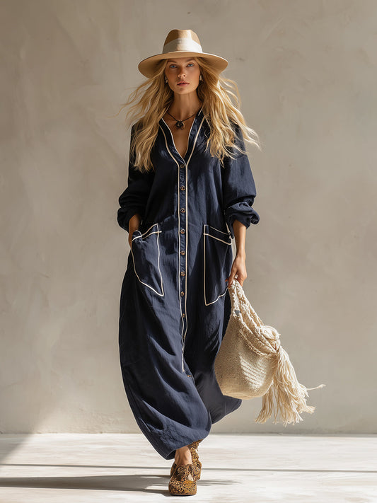 Elegant Urban-style Navy Blue Cotton And Linen Maxi Dress