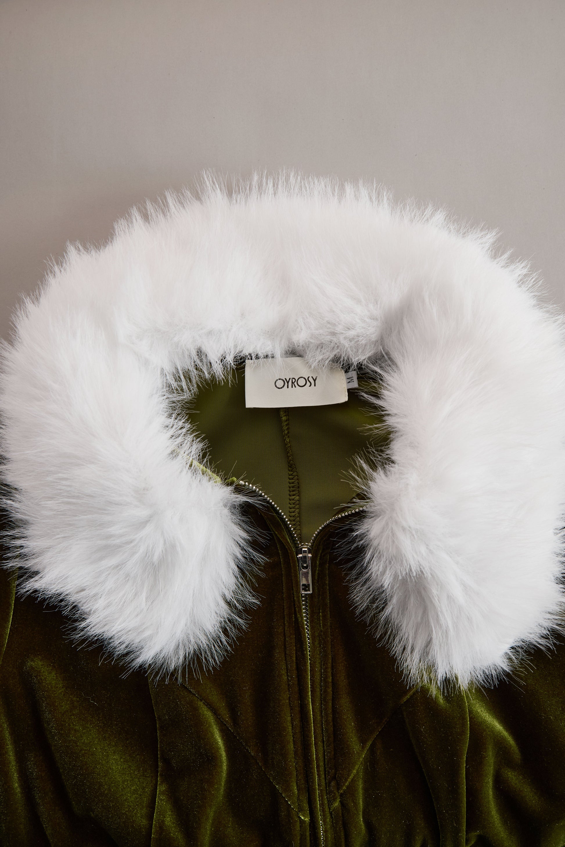 Fashion Retro Rose Red Velvet Faux Fur Collar Long Sleeve Flared Jumpsuit